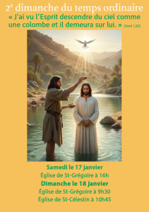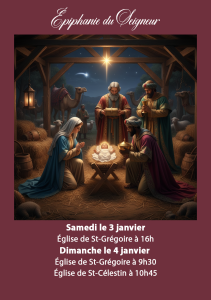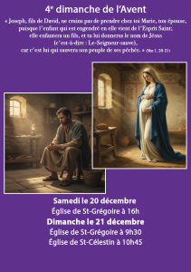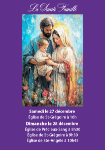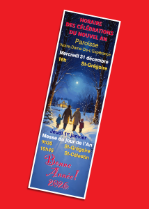 Messe de la nuit de Noël : Dimanche 25 décembre : St-Célestin à 19h30 / Ste-Angèle à 19h30 / Précieux-Sang à 21h30 / St-Grégoire à Minuit. Messe du jour de Noël :Lundi 25 décembre à 10h à l'église de St-Grégoire